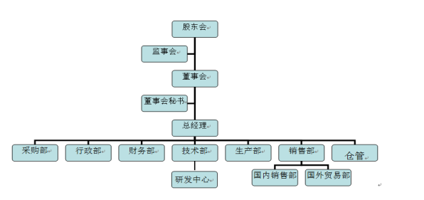 公司根據業務流程,設計和建立了組織架構,目前設立了8個職能部門,部門除了各負其責外,部門之間還相互協調合作,確保管理責任的落實。